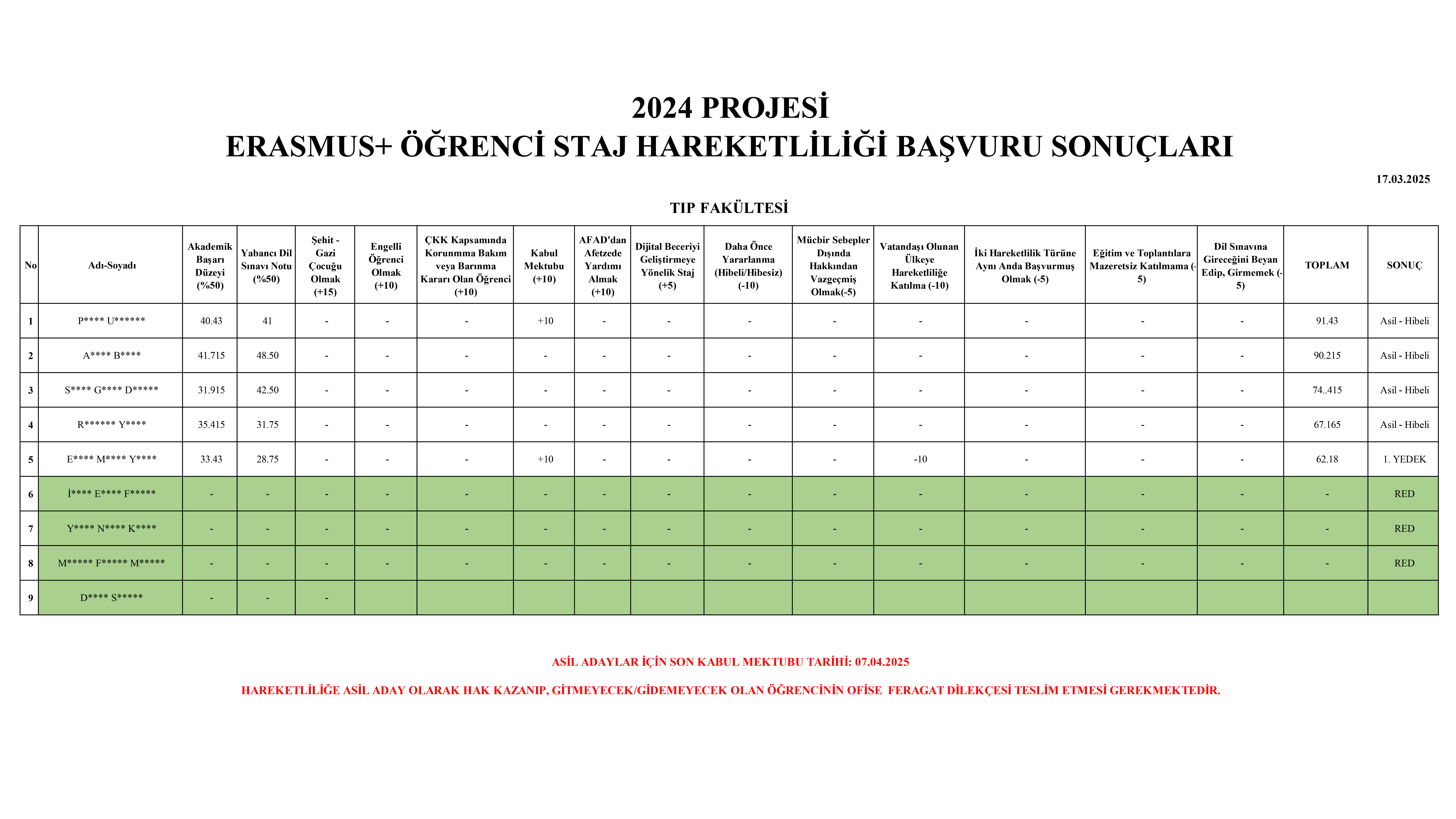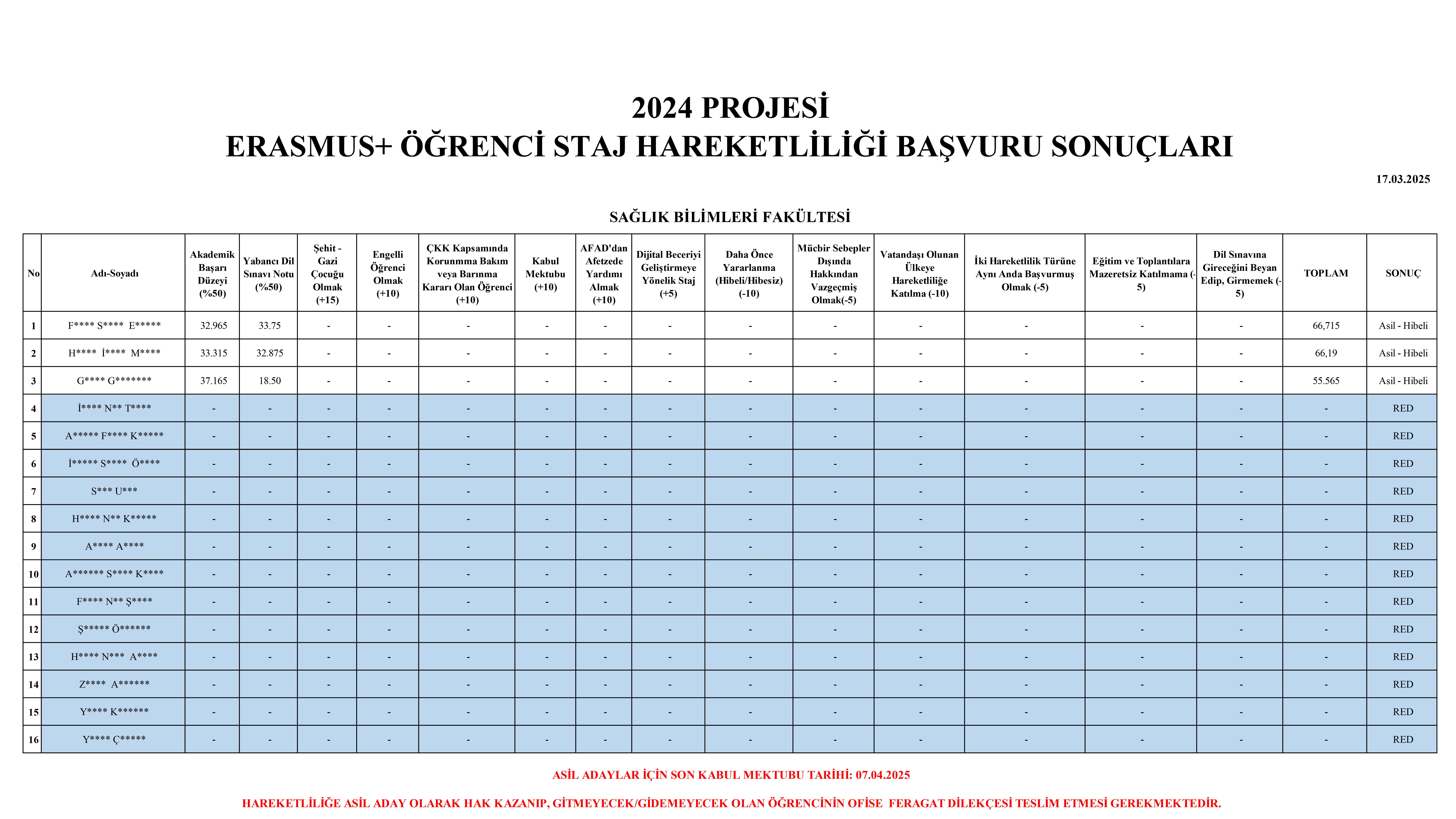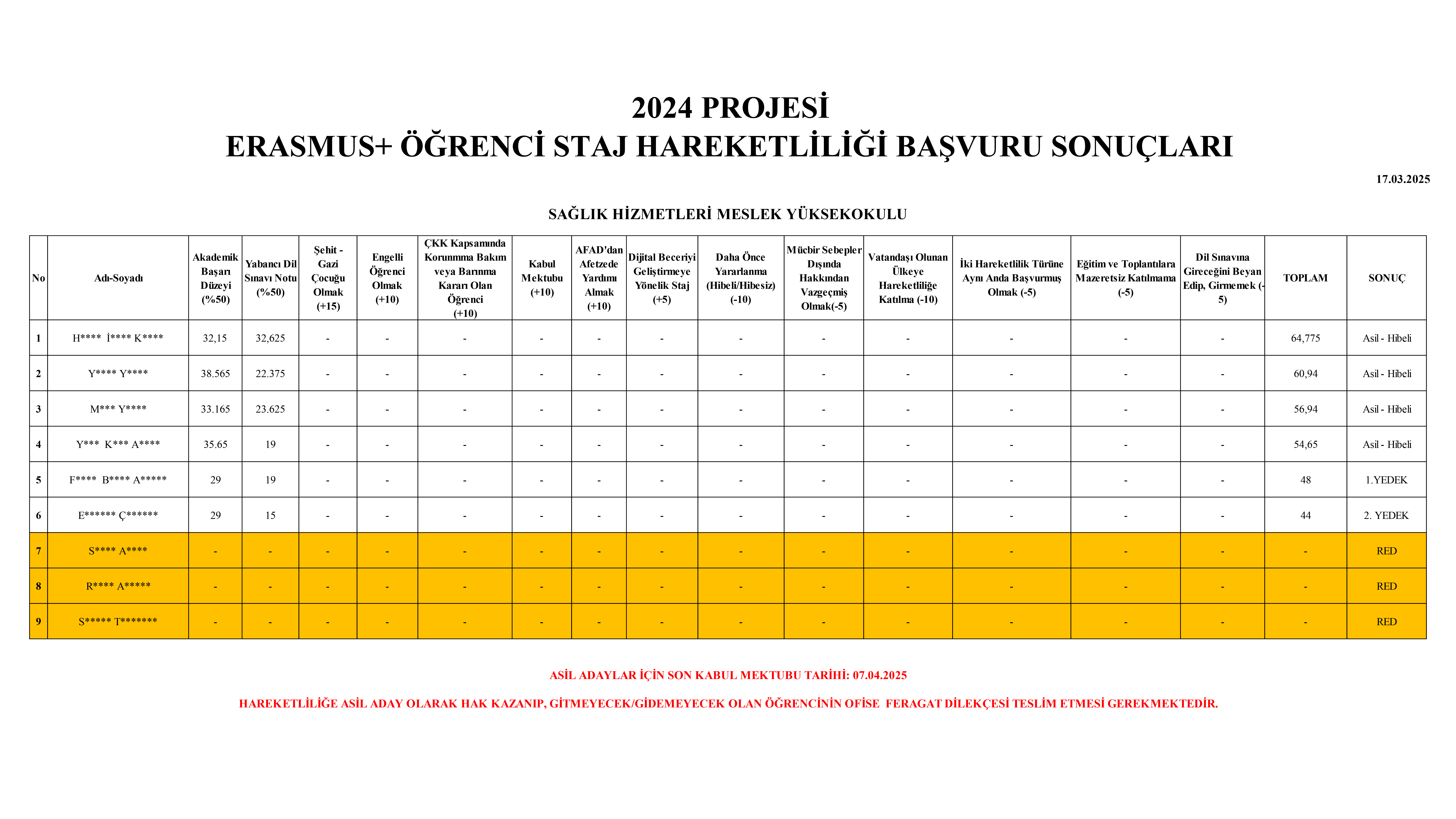 2024 PROJESİ ERASMUS+ ÖĞRENCİ STAJ HAREKETLİLİĞİ BAŞVURU SONUÇLARI