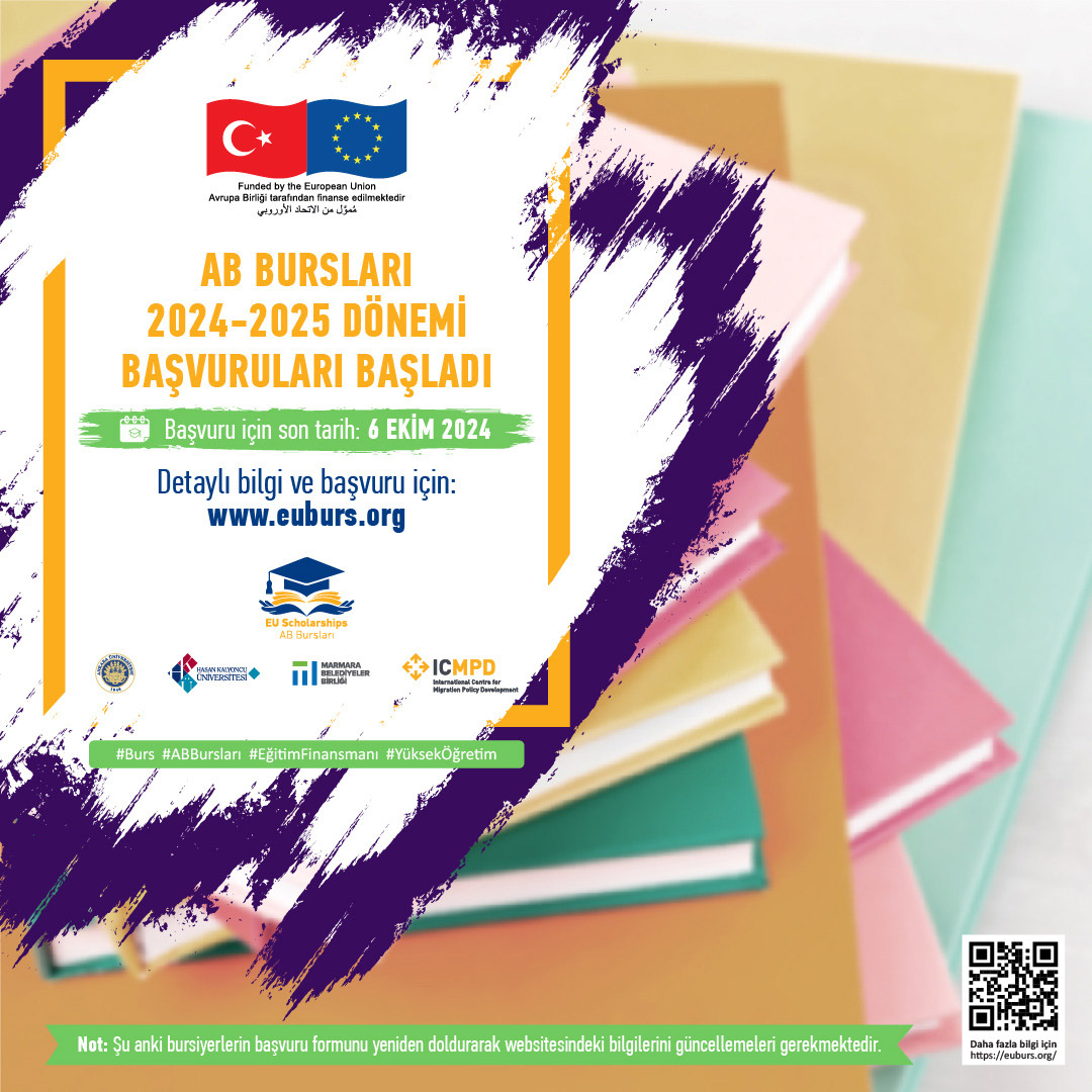 Avrupa Birliği tarafından fonlanan ve ICMPD, Ankara Üniversitesi Hasan Kalyoncu Üniversitesi ve Marmara Belediyeler Birliği Partnerliği’nde yürütülen Avrupa Birliği Bursları Projesi kapsamında burs başvuruları 2024-2025 akademik yılı için 1 Eylül itibariyle başladı! Türkiye’de geçici koruma altındaki Suriyeli öğrenciler, uluslararası koruma altındaki öğrenciler ve Türk vatandaşları için özellikle de dezavantajlı grupları önceleyerek yükseköğretime erişimi artırmayı amaçlayan AB Bursları Pprogramı, eğitim ve kariyer yolculuğundaki gençlere büyük bir fırsat sunuyor.