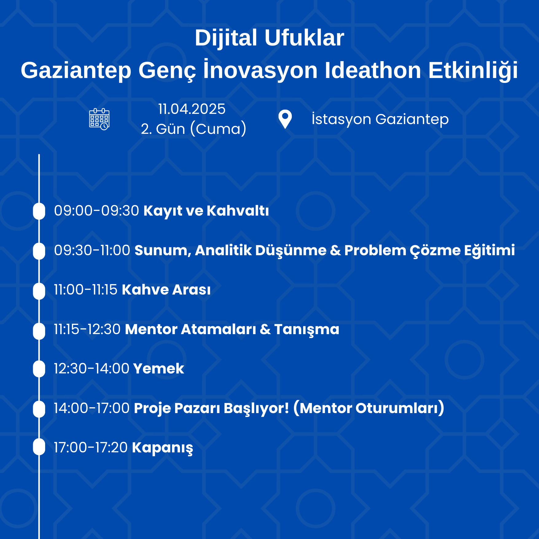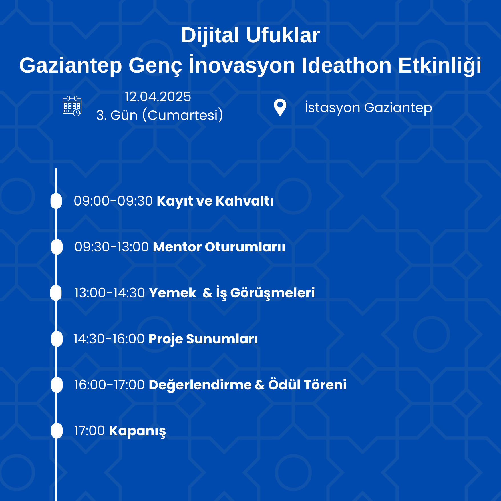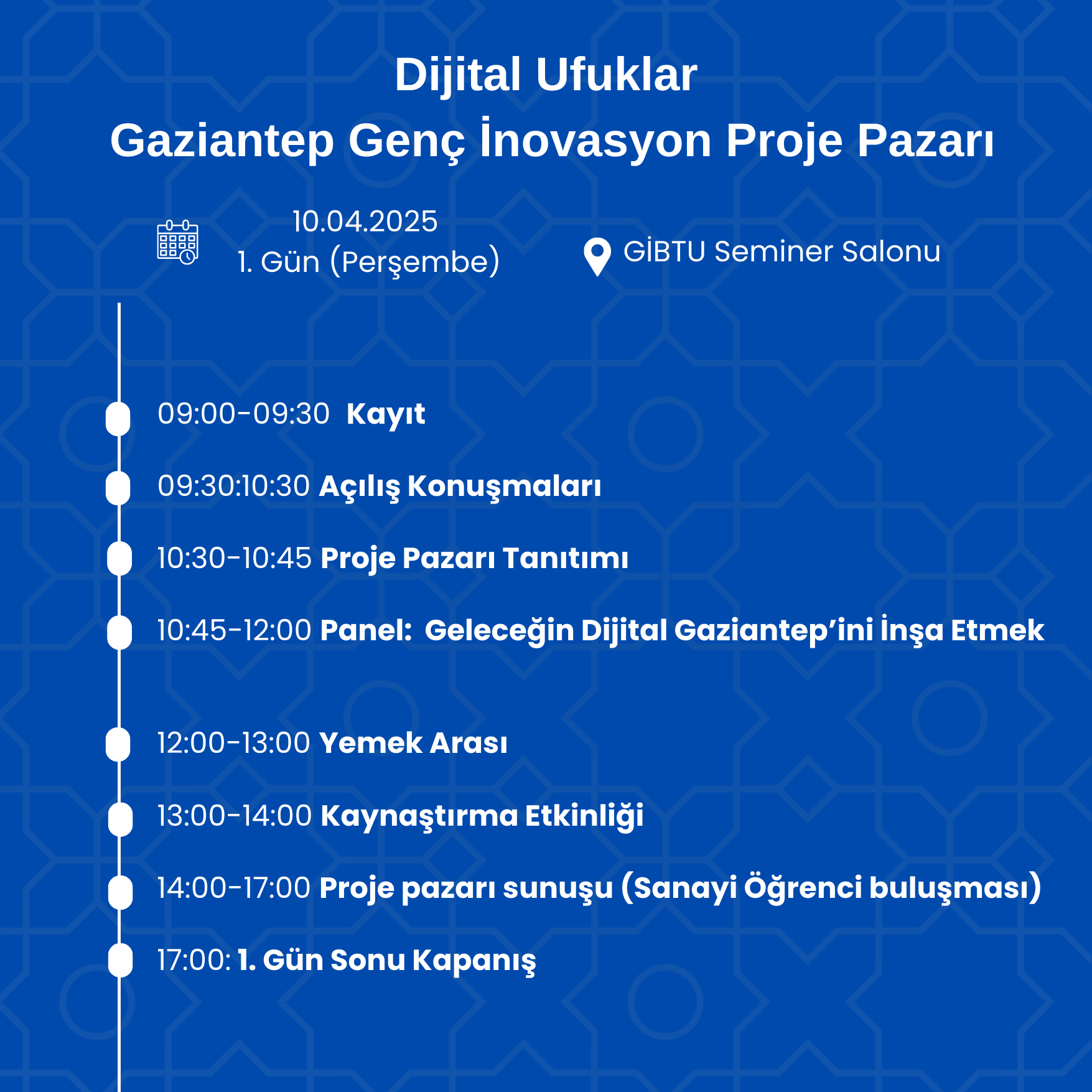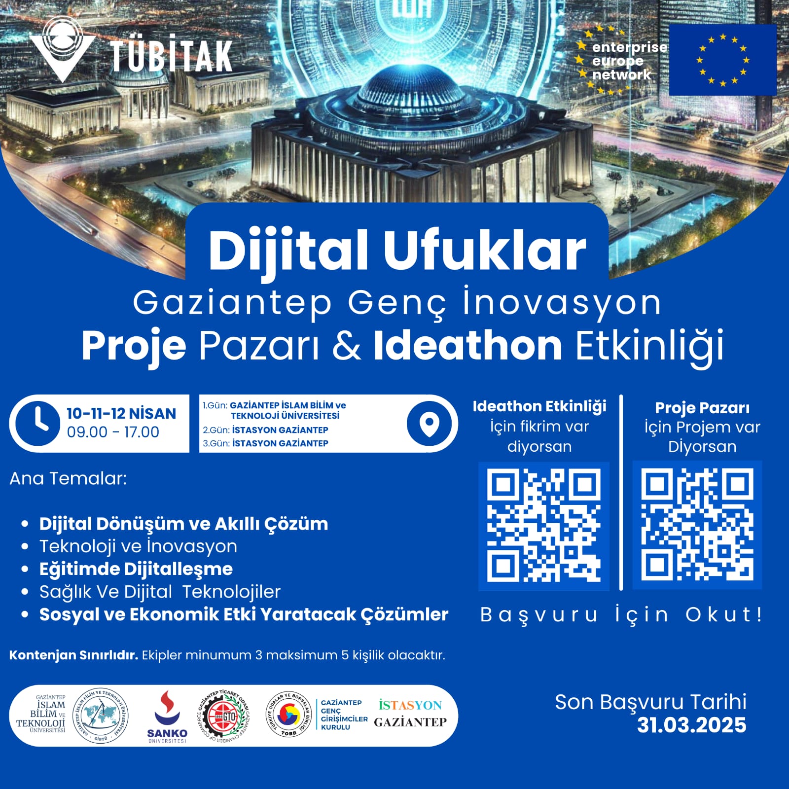 Gaziantep İslam Bilim ve Teknoloji Üniversitesi (GİBTÜ), SANKO Üniversitesi, Gaziantep Ticaret Odası, Gaziantep Genç Girişimciler Kurulu, İstasyon Gaziantep iş birliğiyle düzenlenen Dijital Ufuklar: Gaziantep Genç İnovasyon Proje Pazarı, 10-11-12 Nisan 2025 tarihlerinde GİBTÜ Kampüsü ve İstasyon Gaziantep’te gerçekleşecek! 🎯