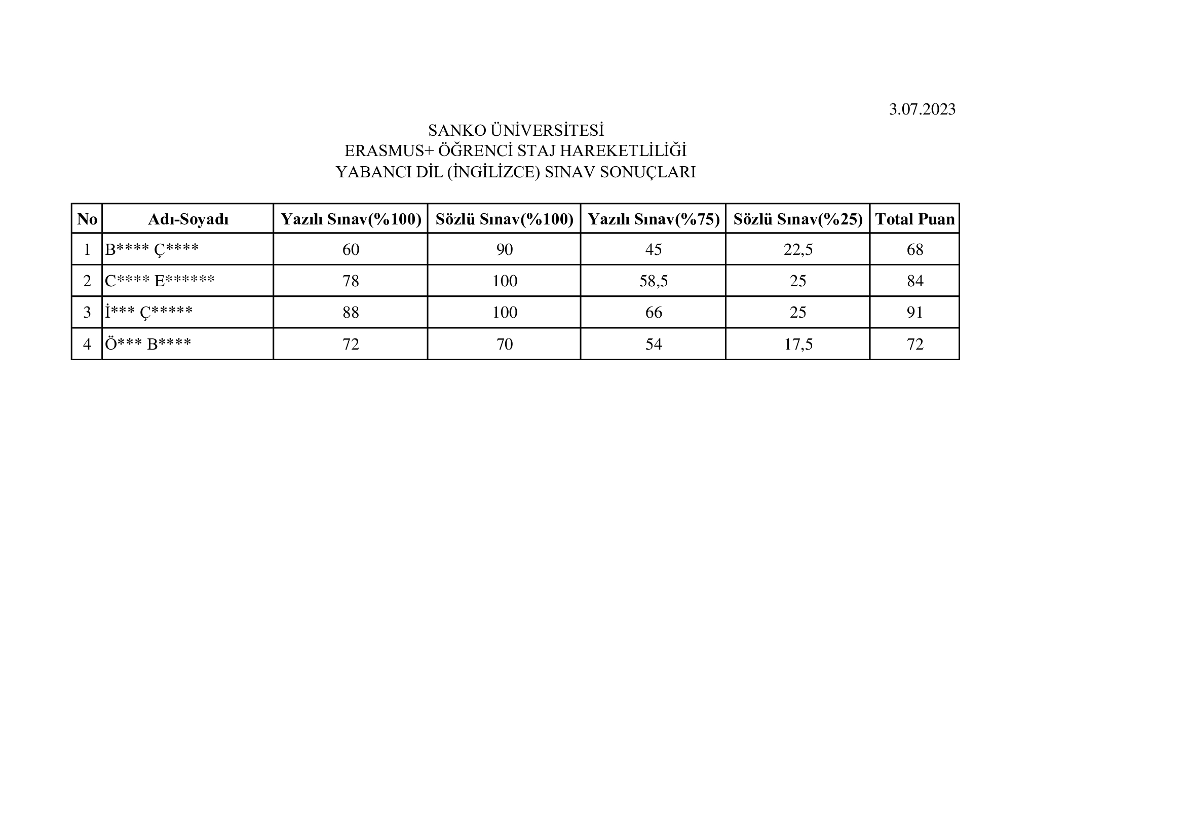 Erasmus+ Öğrenci Staj Hareketliliği ilanına başvuran öğrenciler için yapılan Yabancı Dil Sınavının sonucu için tıklayınız.