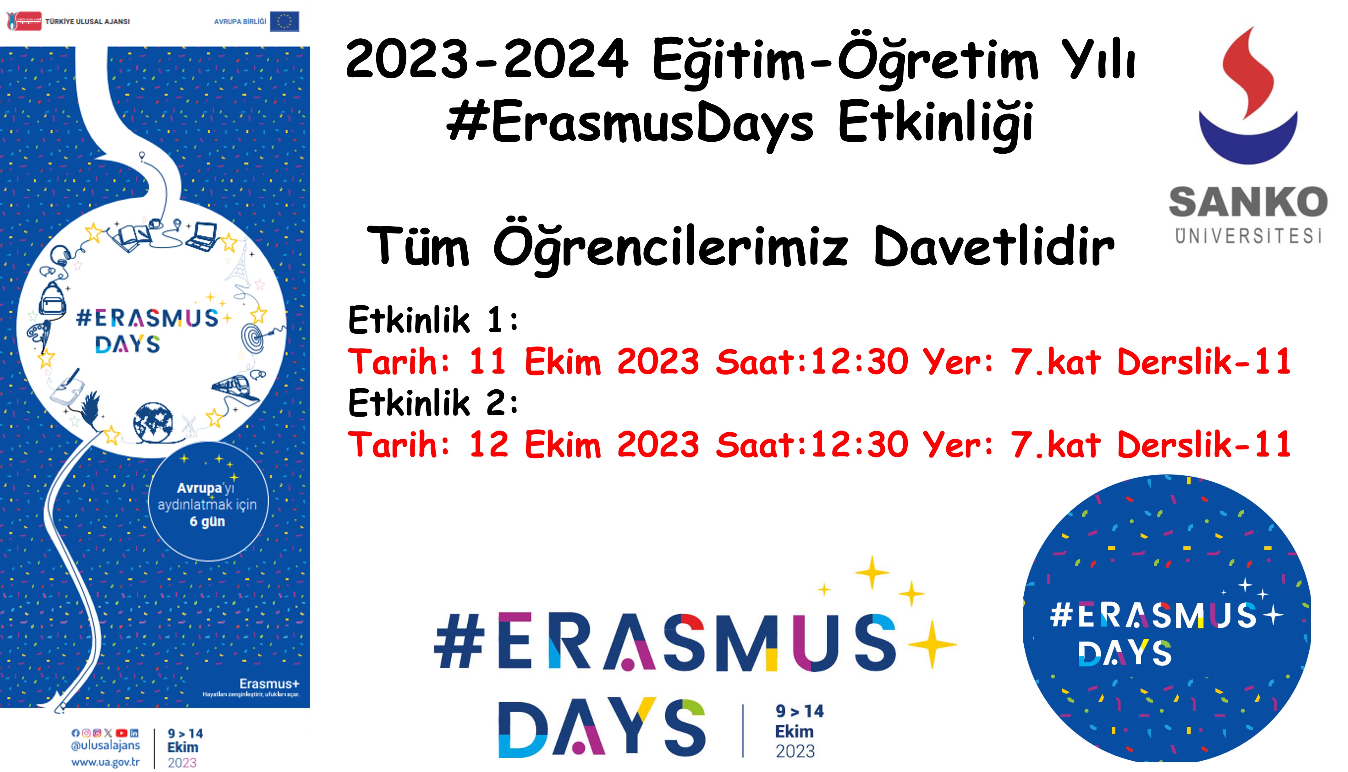 11-12 Ekim 2023 tarihlerinde saat 12.30-13.30 arasında hepinizi Üniversitemiz 7. kat Derslik-11’de etkinliğimize katılmaya, Erasmusla ilgili aklınıza takılan soruları cevaplamaya ve deneyimlerinizi aktarmaya davet ediyoruz.