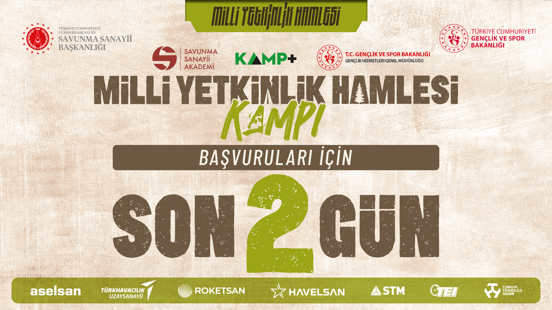 Savunma Sanayii Başkanlığı ve T.C. Gençlik ve Spor Bakanlığı iş birliğiyle düzenlenen “Milli Yetkinlik Hamlesi Kampı” son başvuru tarihi 29 Ocak! Kampa katılan öğrencilere, program sonunda e-Devlet üzerinden geçerli katılım belgesi ve sürpriz hediyeler verilecektir.