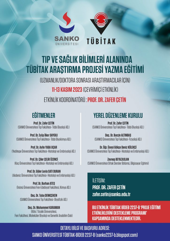 Etkinlik koordinatörlüğünü SANKO Üniversitesi Öğretim Üyesi Prof. Dr. Zafer ÇETİN’in yapmakta olduğu ve TÜBİTAK BİDEB 2237-B ‘Proje Eğitimi Etkinliklerini Destekleme Programı‘ kapsamında desteklenen ‘Tıp ve Sağlık Bilimleri Alanında TÜBİTAK Araştırma Projesi Yazma Eğitimi (Uzmanlık/Doktora Sonrası Araştırmacılar İçin)’ başlıklı etkinlik 11-13 Kasım 2023 tarihleri arasında çevrimiçi olarak ücretsiz bir şekilde gerçekleştirilecektir.
