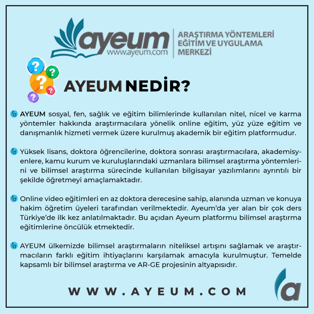 AYEUM ,Sosyal, Fen, Sağlık ve eğitim bilimlerinde kullanılan nitel, nicel ve karma yöntemler hakkında araştırmacılara yönelik video kayıt eğitimler sunan bir platformdur.