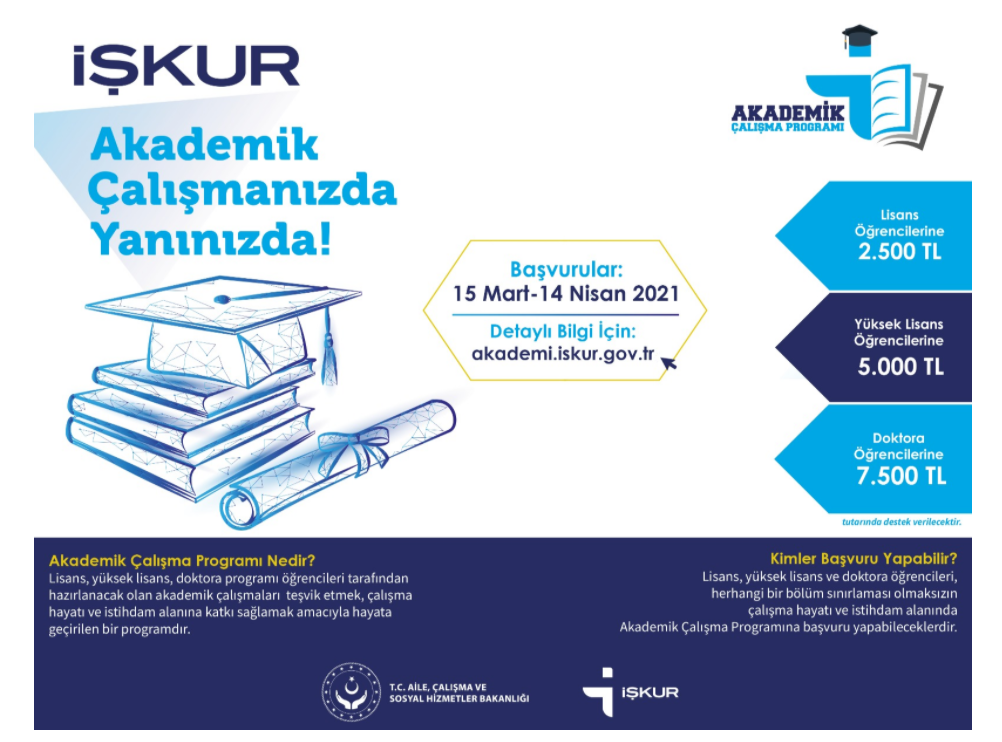 TL destek sağlanacaktır. İŞKUR’un sağlayacağı destekten faydalanmak isteyenler başvurularını 15 Mart – 14 Nisan 2021 tarihleri arasında akademi.iskur.gov.tr adresinden yapabileceklerdir. Detaylı bilgi için 0342 322 0343/727 numaralı telefondan İŞKUR’a ulaşabilirsiniz.