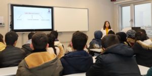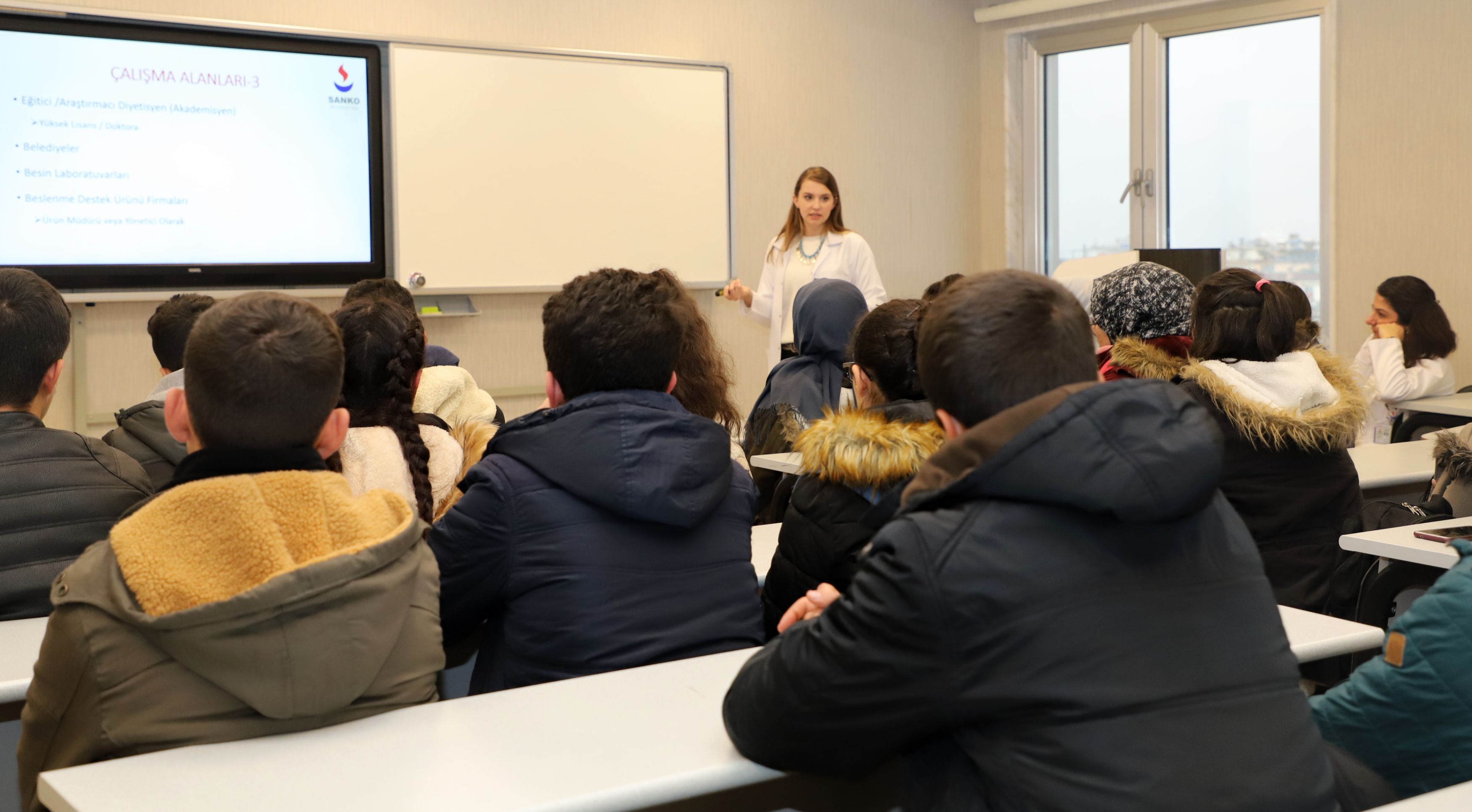 Rehberlik Birimi Öğretmeni Fatma Nur İspenoğlu ile birlikte SANKO Üniversitesi’ne gelen öğrencilere, Sağlık Bilimleri Fakültesi Hemşirelik Bölümü Halk Sağlığı Hemşireliğinden Öğr. Gör. Emine Baş, Fizyoterapi ve Rehabilitasyon Bölümünden Öğr. Gör. Hatice Adıgüzel ve Beslenme ve Diyetetik Bölümünden Diyetisyen Seren Kurtgil, üniversite, bölümler, eğitim ve uygulamalar hakkında bilgi verdi.