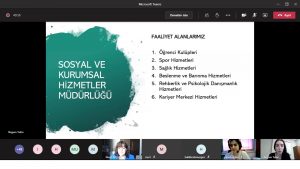 Sosyal Kurumsal Hizmetler Müdürü Begüm Tekin, müdürlüğün faaliyet alanlarından bahsederek, ders dışı zamanların planlanması ve yapılacak organizasyonların öğrencilerle birlikte yürütüldüğünü ve saha çalışmalarına ağırlık verdiklerini iletti.