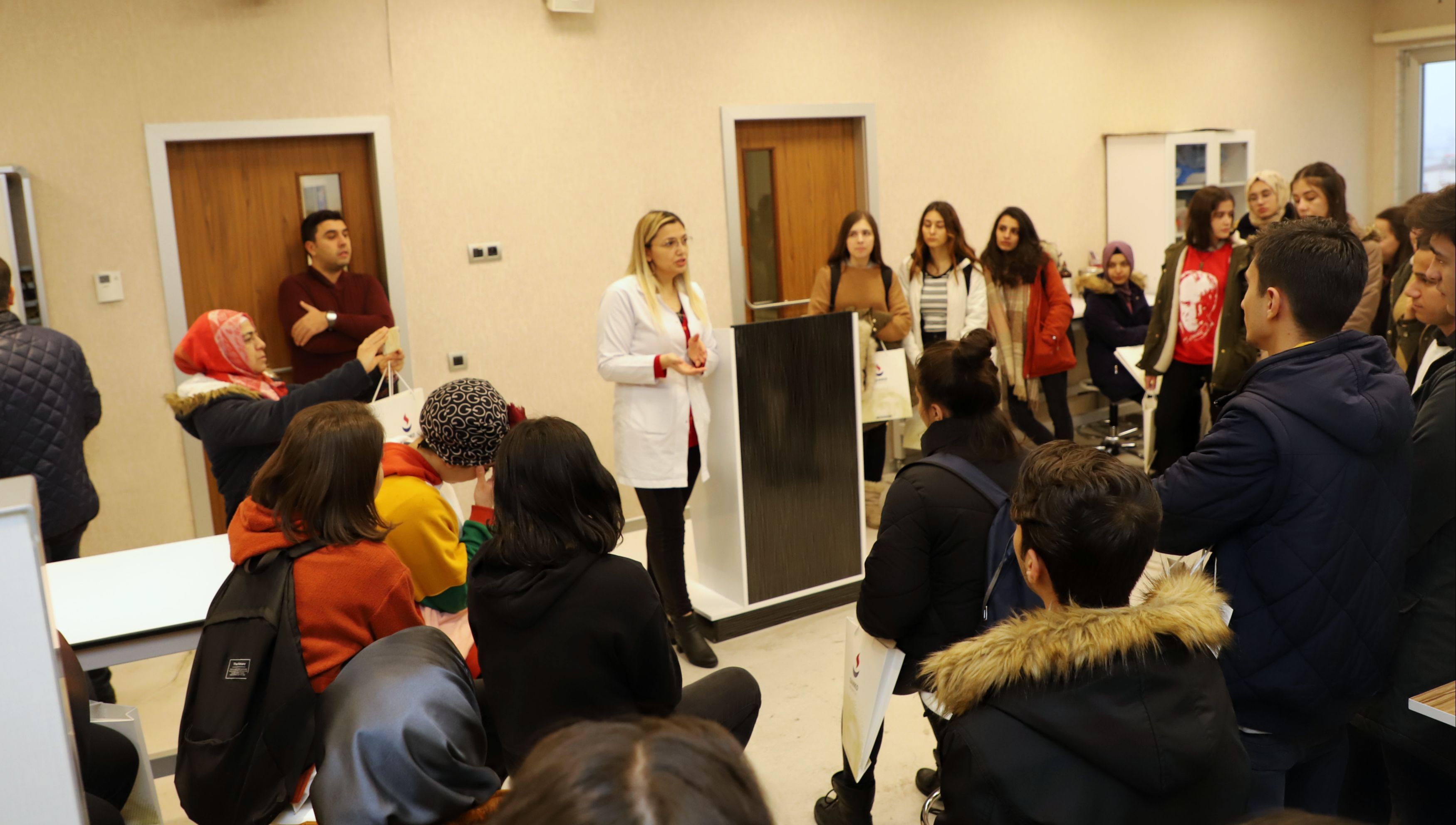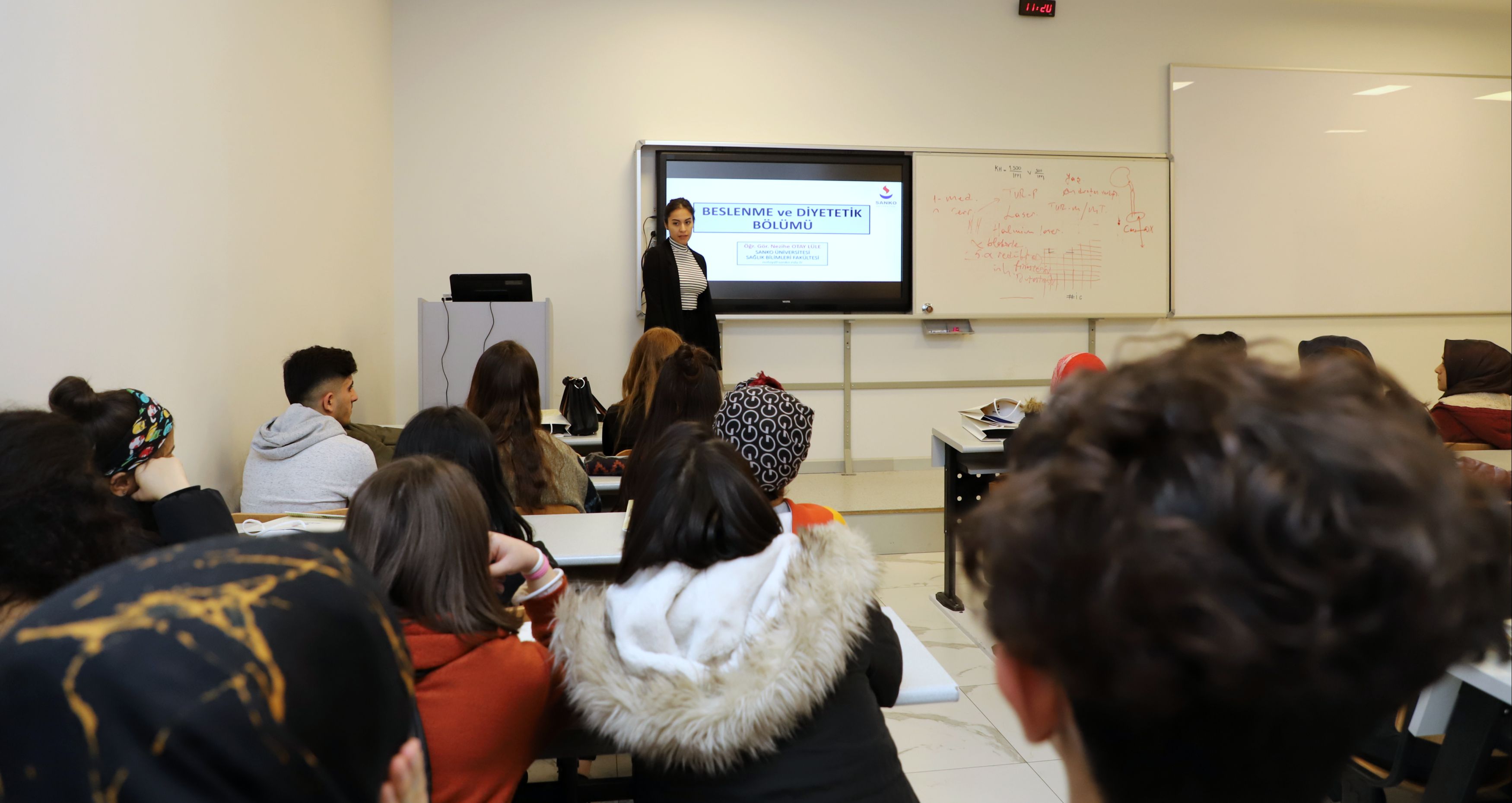 Sağlık Bilimleri Fakültesi Beslenme ve Diyetetik Bölümü’nden Öğr. Gör. Nezihe Otay Lüle, ders içerikleri ve faaliyetleri konusunda sunum yaparak, uygulamaların yapıldığı beslenme laboratuvarını öğrencilere tanıttı.