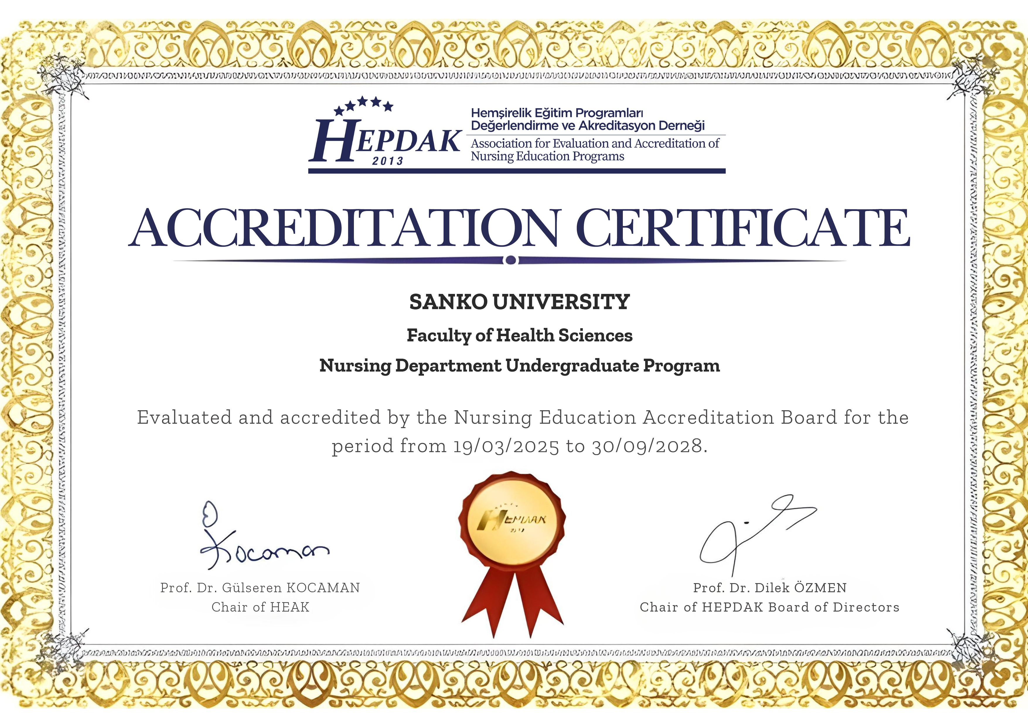 SANKO University Faculty of Health Sciences Nursing Department was accredited for the first time by the Nursing Education Programs Accreditation Board (HEAK)  2 years between 07.04.2023- 30.09.2025.