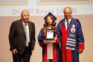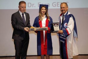Tıp Fakültesini birincilikle tamamlayan Dr. Esra Genç’e Vali Davut Gül ile Rektör Prof. Dr. Dağlı, ikincilikle mezun olan Dr. Elif Beyza Şahin’e Mütevelli Heyet Başkanı Abdulkadir Konukoğlu ile Rektör Yardımcısı Prof. Dr. Metin Bayram, üçüncülükle tamamlayan Dr. Mete Birışık’a ise SANKO Holding Onursal Başkanı Zeki Konukoğlu ile Tıp Fakültesi Dekanı Prof. Dr. Salih Murat Akkın diploma ve armağan takdim etti.
