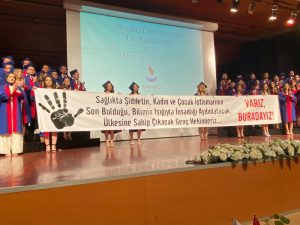 Öğrenciler, mezuniyet töreni sırasında sahneye “Sağlıkta şiddetin, kadın ve çocuk istismarının son bulduğu, bilimin ışığıyla insanlığı aydınlatacak, ülkesine sahip çıkacak genç hekimleriz” pankartıyla çıktılar.