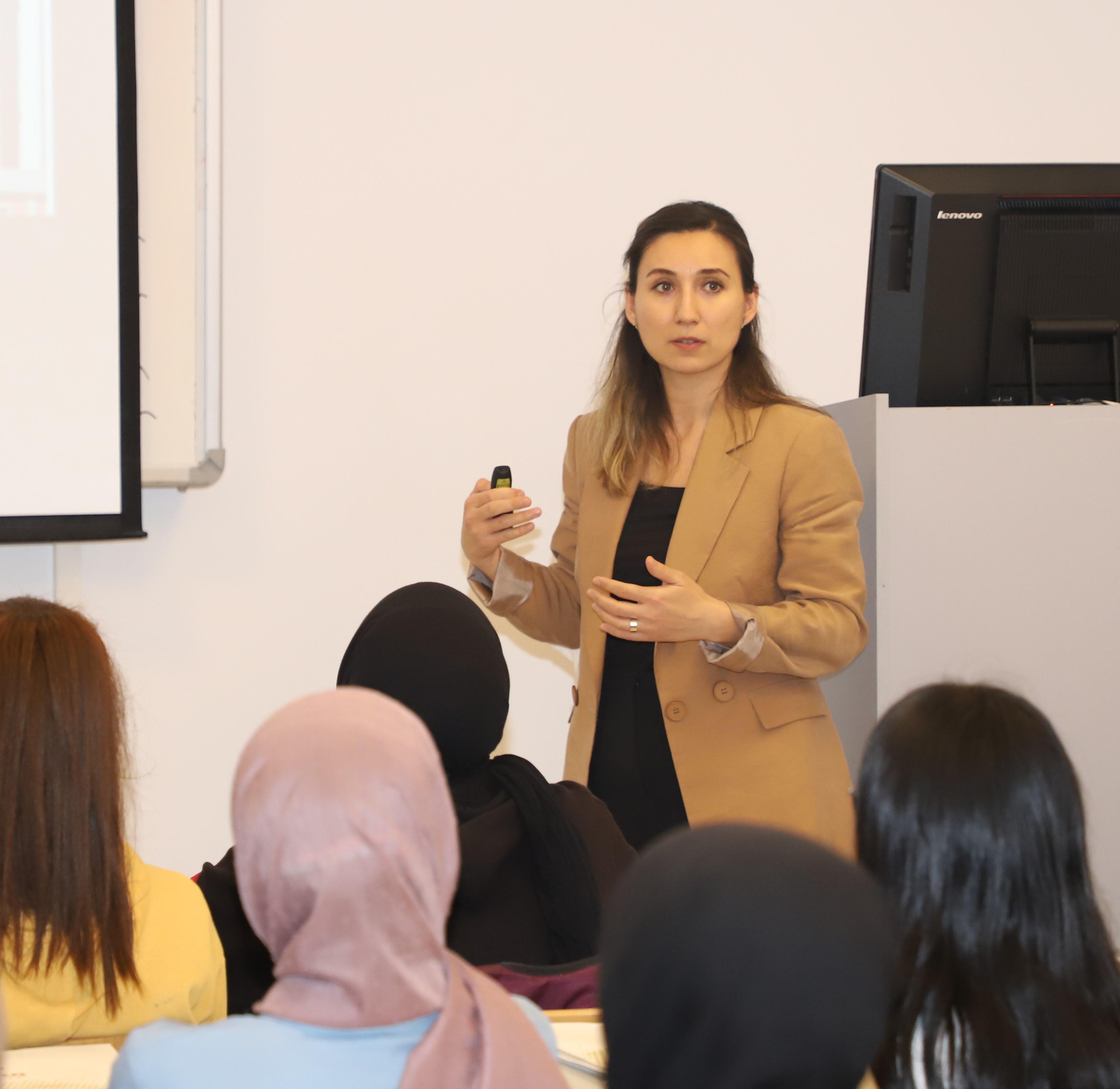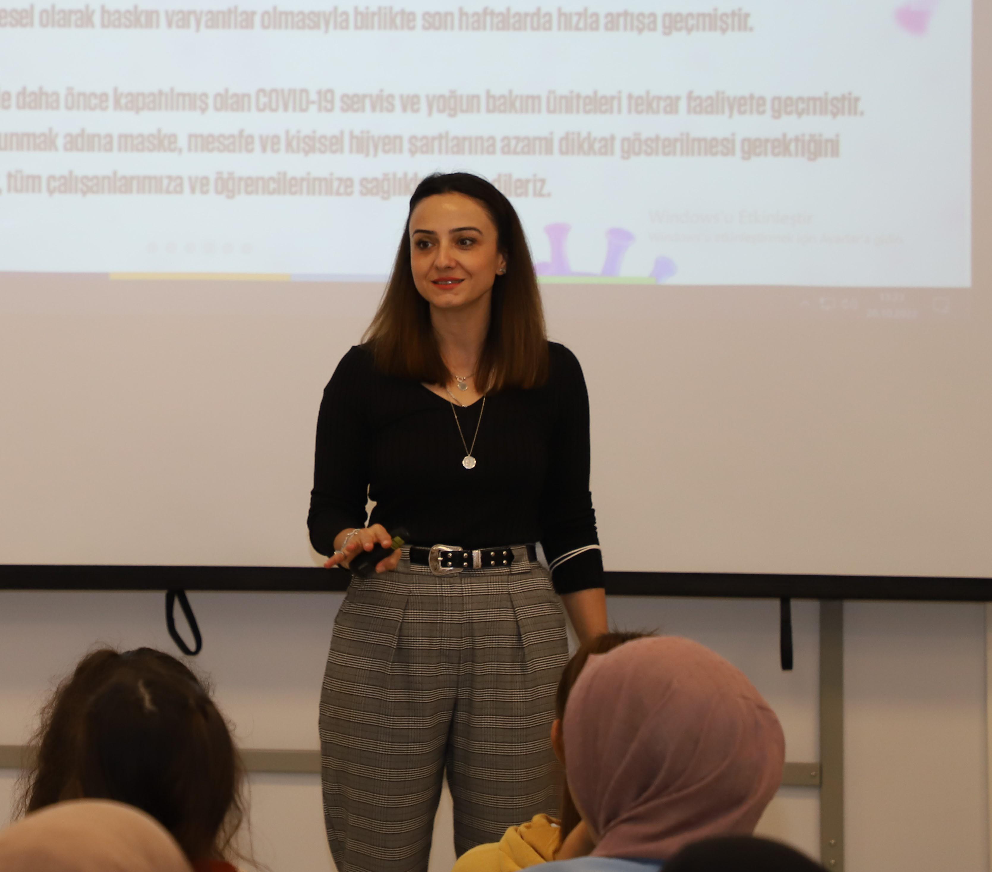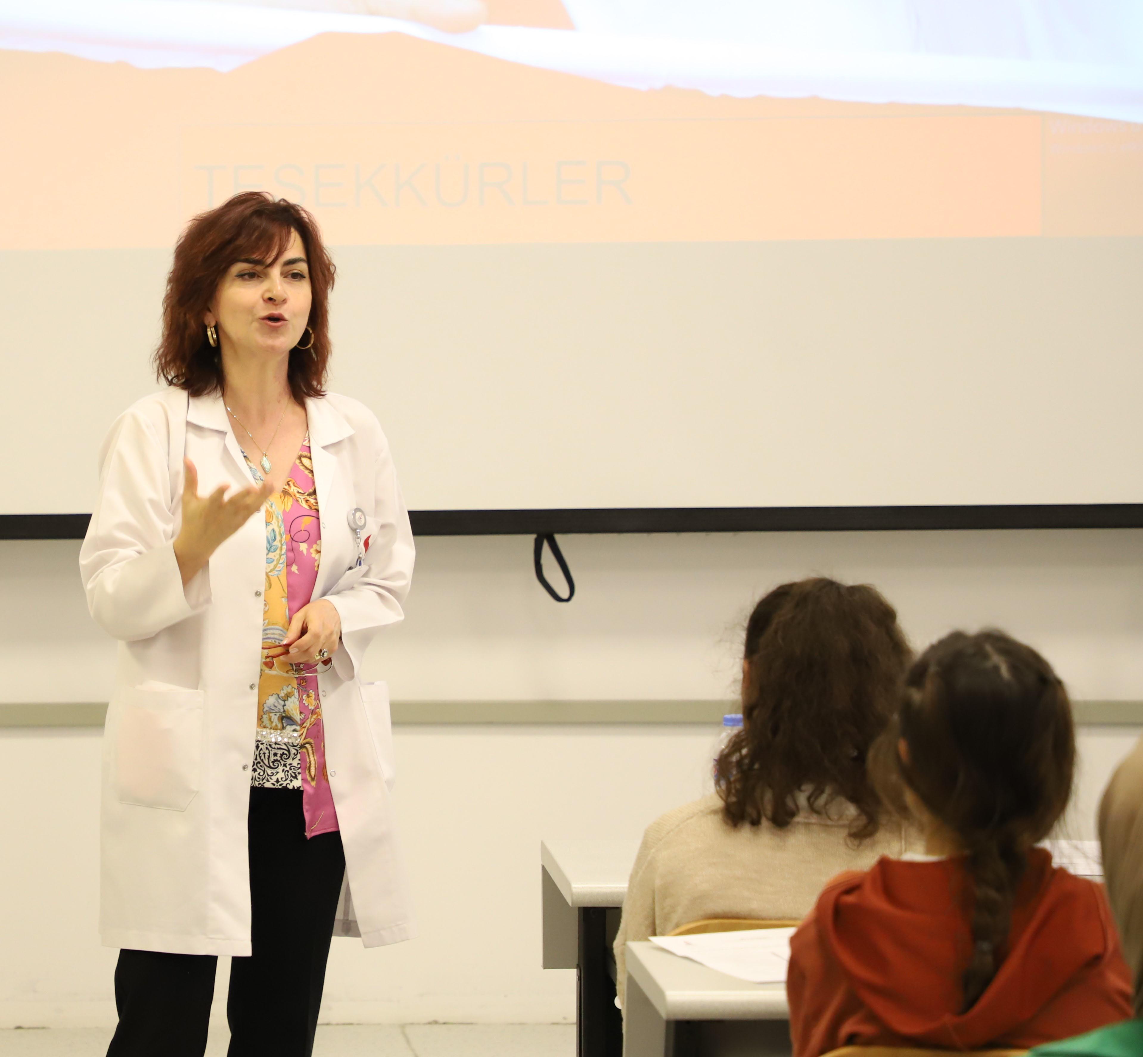 Öğrencilere üniversitede verilen eğitim, tıp fakültesi ve hekimlik mesleği ile ilgili bilgiler veren Tıp Fakültesi Tıbbi Farmakoloji Ana Bilim Dalı Başkanı Prof. Dr. Mehtap Özkur ise hekimliğin tüm dünyada saygın bir meslek olduğunu kaydetti.