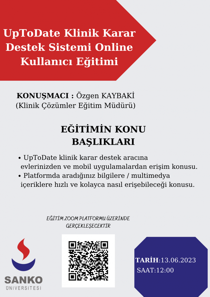 Sanko Üniversitesi Bilimsel Araştırma ve Danışma Kurulu tarafından organize edilen UpToDate Kullanıcı Eğitim Toplantısı 13.06.2023 Salı saat:12:00’de düzenlenecektir. UpToDate veri tabanı, 25 Uzmanlık alanında, 7400’den fazla uzman doktor tarafından hazırlanan 12.400’den fazla konu içeriğine erişim sunmakta olan kanıta dayalı bir klinik karar destek sistemidir. UpToDate; sürekli güncellenen, kanıta dayalı klinik bilgilerle donatılmış ve kullanımı kolay arayüzü ile dünyanın en çok kullanılan klinik bilgi kaynakları arasında yer almaktadır. Doktorlar tarafından hastalık teşhisinde bulunulması, tedavi planı hazırlanması ve klinik bilgilerin hızlı ve etkin şekilde paylaşılmasına olanak verecek şekilde tasarlanmıştır.
