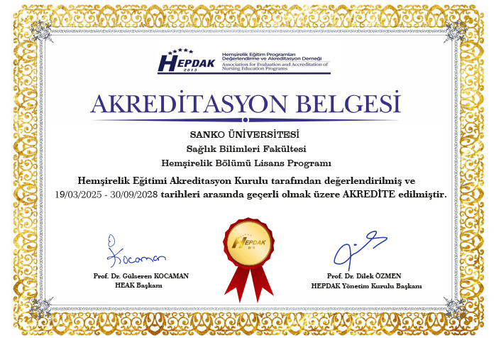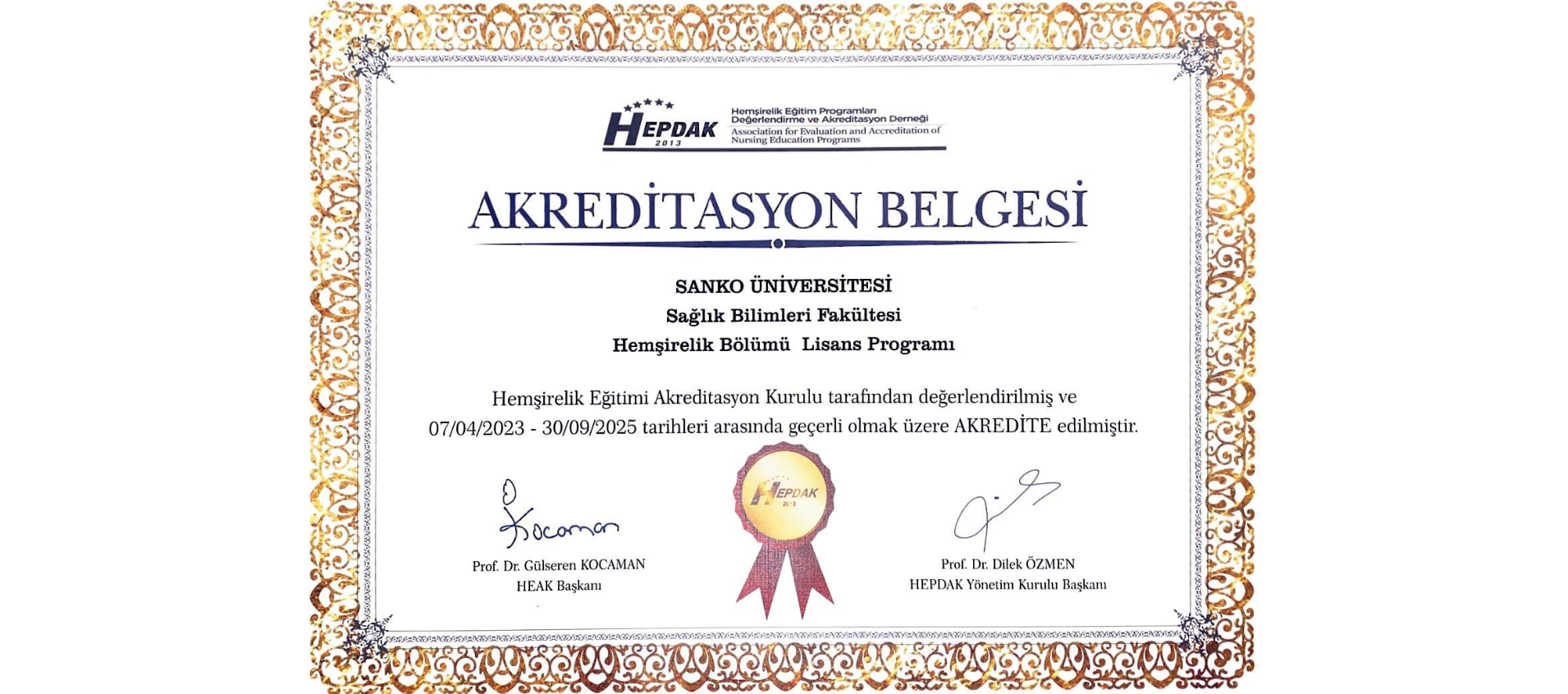 SANKO Üniversitesi Sağlık Bilimleri Fakültesi Hemşirelik Bölümü, Hemşirelik Eğitim Programları Akreditasyon Kurulu (HEAK) tarafından ilk kez 07.04.2023- 30.09.2025 tarihleri arasında 2 yıl süreli akredite olmuştur.